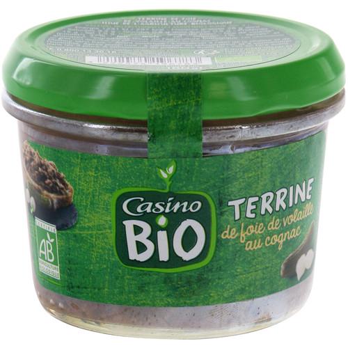 Terrine de Foie de Volaille au Cognac issue de l'Agriculture Biologique. Ingrédients : Gorge de porc* - foie de volaille* 37% - _lait_* - _oeufs_*...