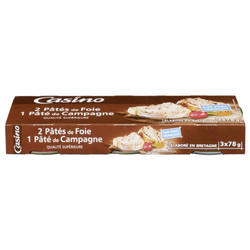 Combiné 2 pâté de foie qualité supérieure 78 g et 1 pâté de campagne qualité supérieure 78 g. Ingrédients : Pâté de campagne : viande...