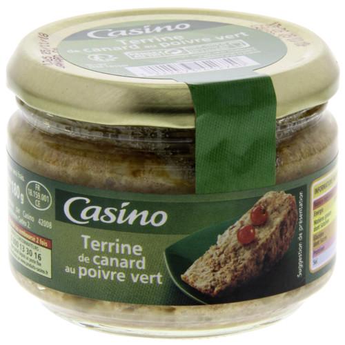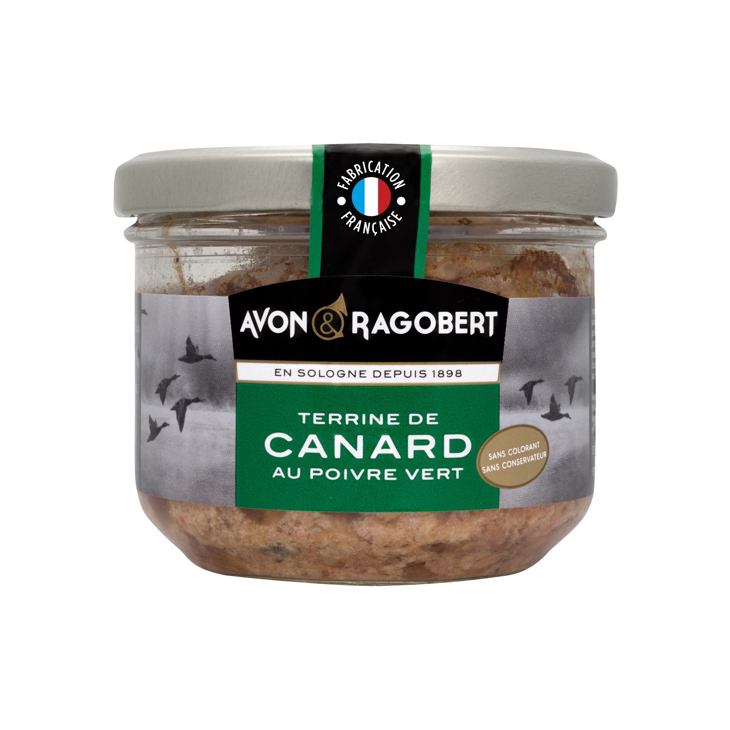 Terrine de canard au poivre vert. Ingrédients : Gorge de porc (origine France), viande de canard (origine UE) 29 %, foie de porc, poivre vert...