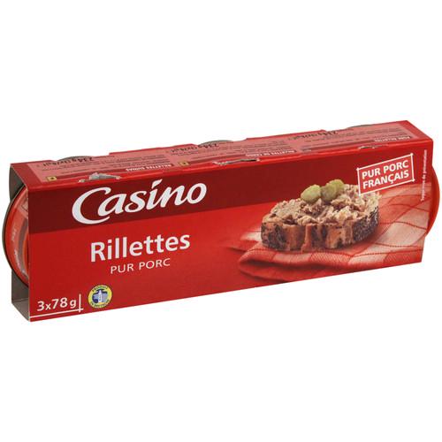 Rillettes. Ingrédients : Viande de porc 90 %, gras de porc, sel de mer, poivre. Quantité : 234 g e (3 * 78 g) Marque...