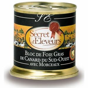 Foie gras. Ingrédients : foie gras de canard, eau, sel, conservateur : sel nitrité, poivre, sucre Quantité : 120 g Marque : Secret d eleveurs,Secret...