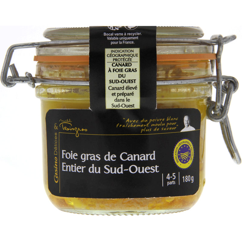 Foie gras de canard entier du Sud-Ouest. Ingrédients : Foie gras de canard du Sud-Ouest (origine France) - sel - poivre blanc 0.2% - conservateur...