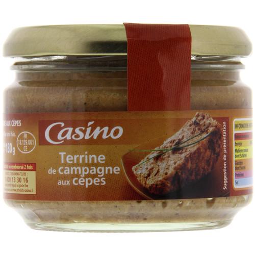 Terrine de campagne aux cèpes. Ingrédients : Gorge de porc (origine : France) 52% - foie de porc 32% - _oeufs_ en poudre - cèpes...
