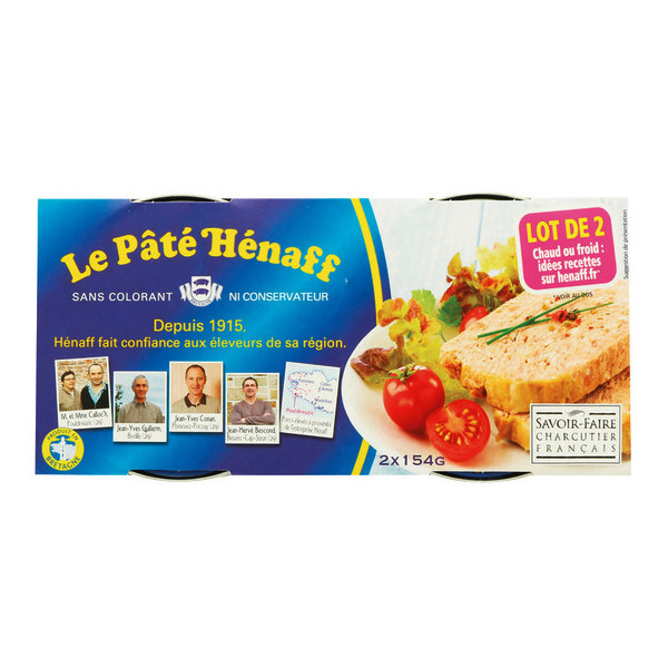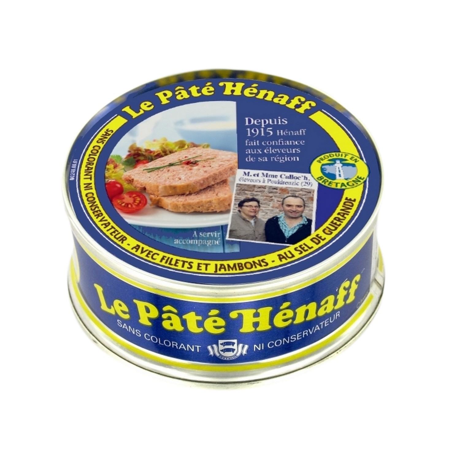 Pâté HENAFF, lot de. Ingrédients : Viande de porc* (91%) dont jambon (20%), fumet, foie de (1 ,5%), sel de Guérande porc ? (1 ,5%),...