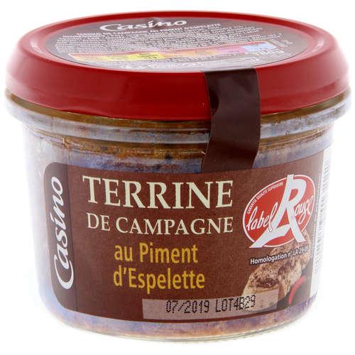 Terrine de Campagne Label Rouge au Piment d'Espelette. Ingrédients : Porc origine france 91% (gorge, foie, épaule) - _lait_ - _oeufs_ - sel - piment...