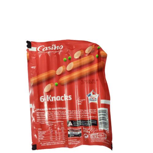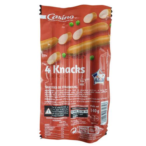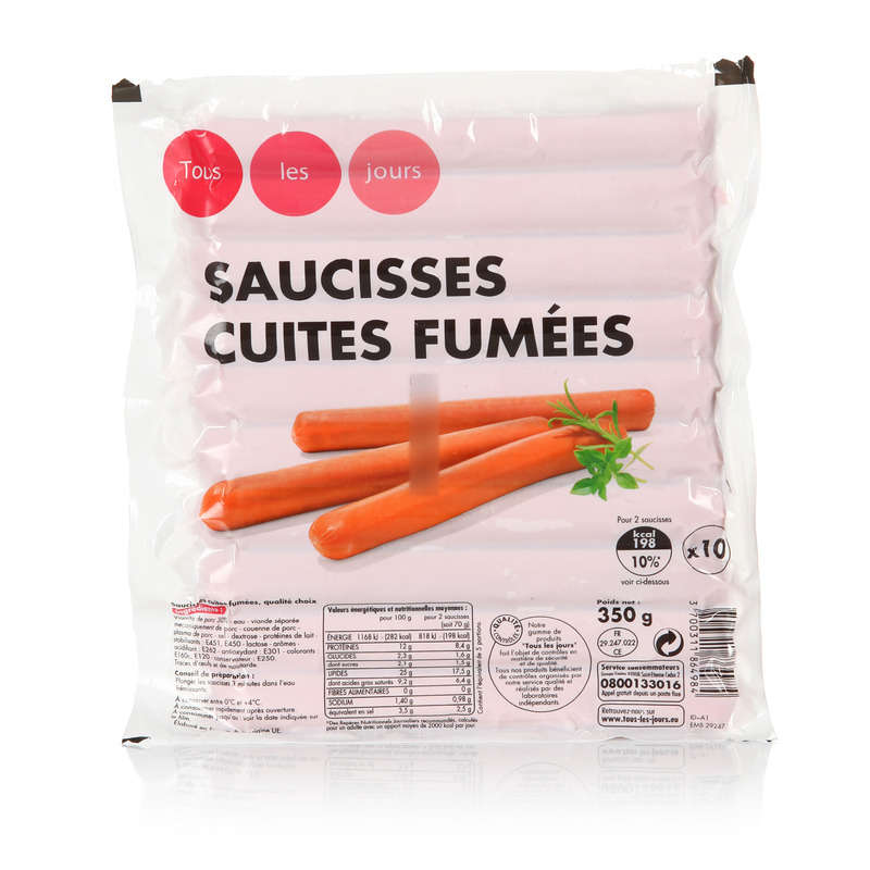 Saucisses cuites fumées. Ingrédients : Viande de porc 26% - eau - viande séparée mécaniquement de porc - couenne de porc - gras de porc...