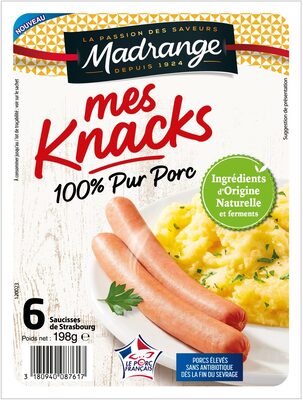 Saucisses de Strasbourg. Ingrédients : viande de porc français élevé sans antibiotique dès la fin du sevrage (42° jour) 73%, eau, gras de porc français...