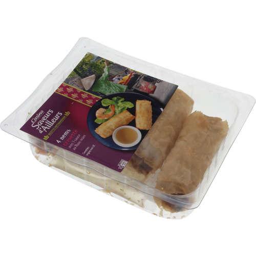 4 galettes de riz (37%) frites garnies d'une farce aux légumes, à la crevette et au cabillaud avec sauce nuoc-mâm. Ingrédients : Nems aux _crevettes_...