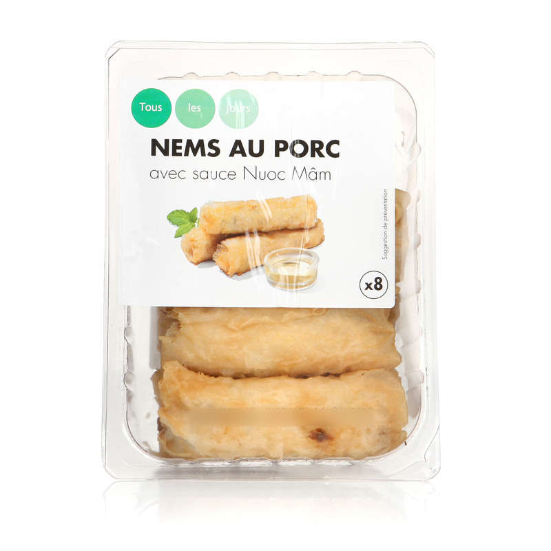 Galettes de riz frites, farcies à la viande de porc et aux légumes avec sauce nuoc-mâm. Ingrédients : Nems au porc 8x70g (96,6%) : galette...