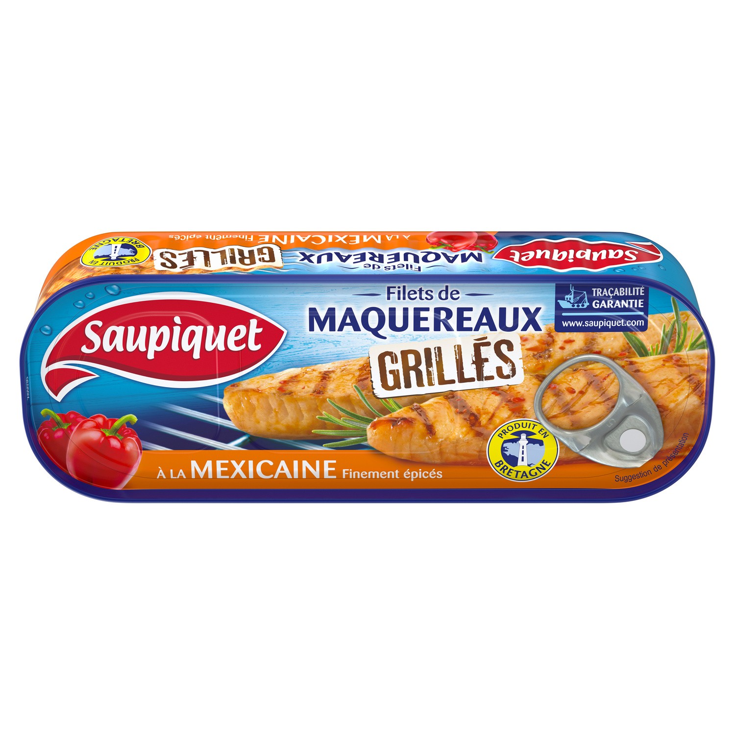 Filets de maquereaux grillés à la mexicaine.Ingrédients : Filets de maquereaux (85 %), eau, sauce aux poivrons rouges grillés 3,8 % (poivrons rouges, huile de...