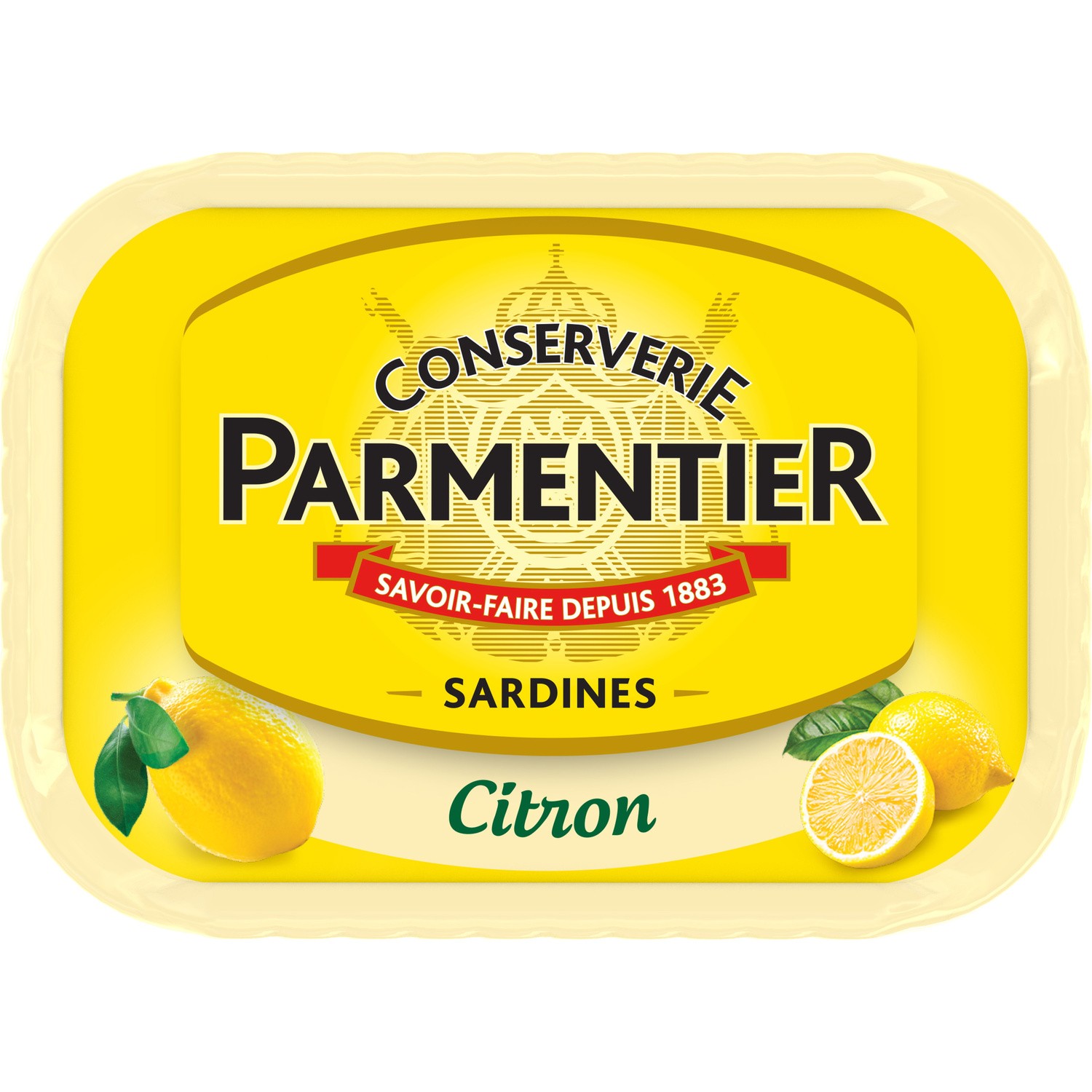 Sardines au citron.Ingrédients : _Sardines_, huile de tournesol, citron (5 %), selQuantité : 135 g (95 g de poisson)Marque : Conserverie Parmentier