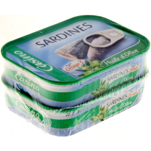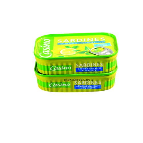 Sardines à l'huile d'olive vierge extra.Ingrédients : _sardines_ - huile d'olive vierge extra 29% - sel.Quantité : 2 x 135 gMarque : Casino