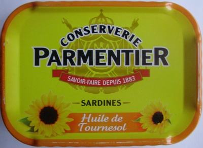 Sardines Huile de tournesol.Ingrédients : _Sardines_, huile de tournesol, sel.Quantité : 135 g (95 g égoutté)Marque : Conserverie ParmentierOrigine : Maroc