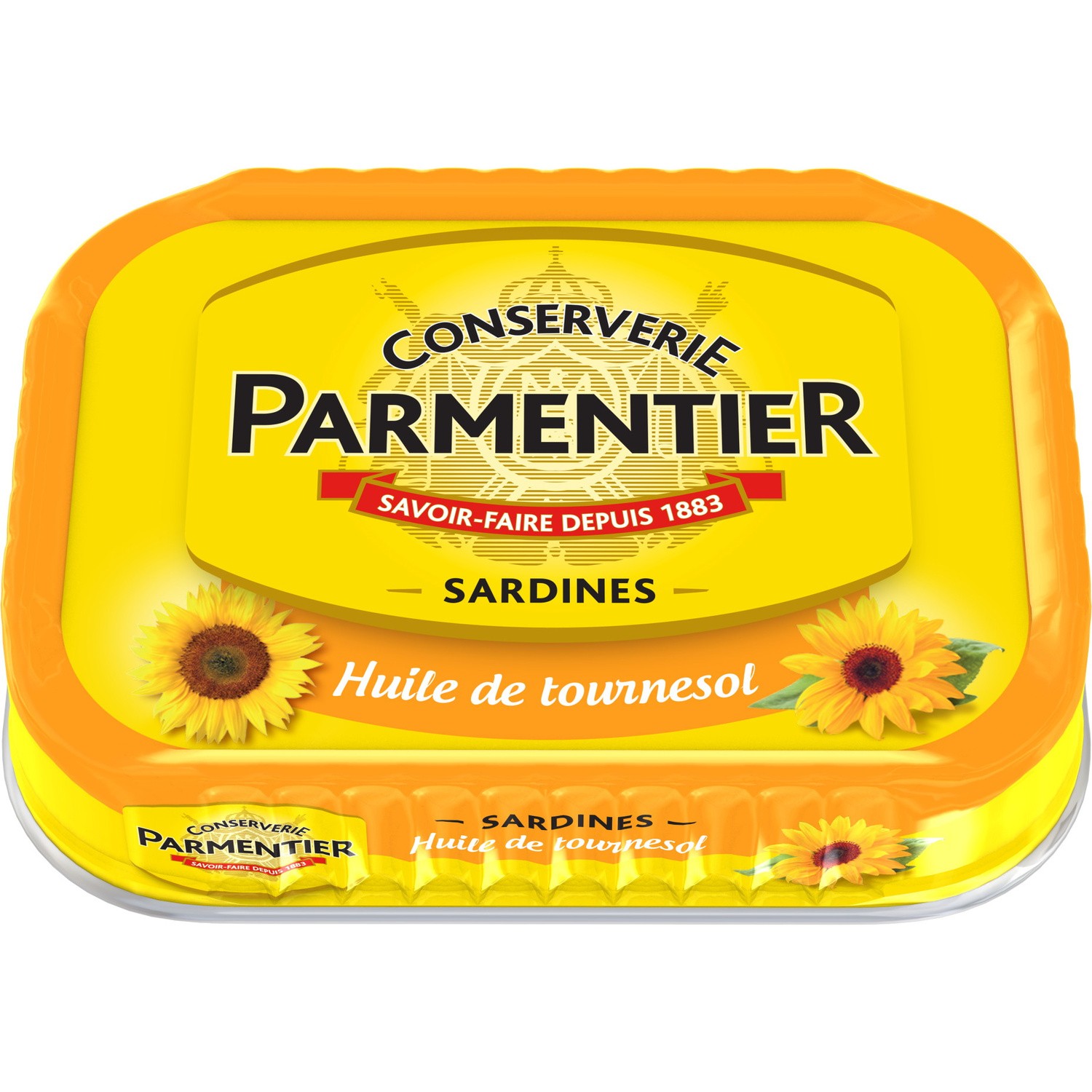 Sardines à l'huile de tournesol.Ingrédients : _Sardines_, huile de tournesol, sel.Quantité : 135 g (95 g de poisson à l'ouverture)Marque : Conserverie ParmentierOrigine : Océan...