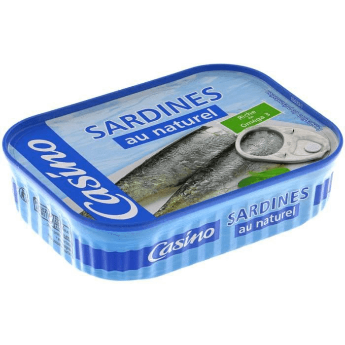 Sardines à l'huile de tournesol.Ingrédients : _Sardines_ - huile de tournesol - sel.Quantité : 135 gMarque : Casino
