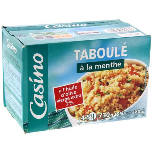Taboulé à l'huile d'olive vierge extra 2% et à la menthe.Ingrédients : Garniture (550g) : tomate 60%* - eau - oignon 9,5%* - poivron 2,7%*...