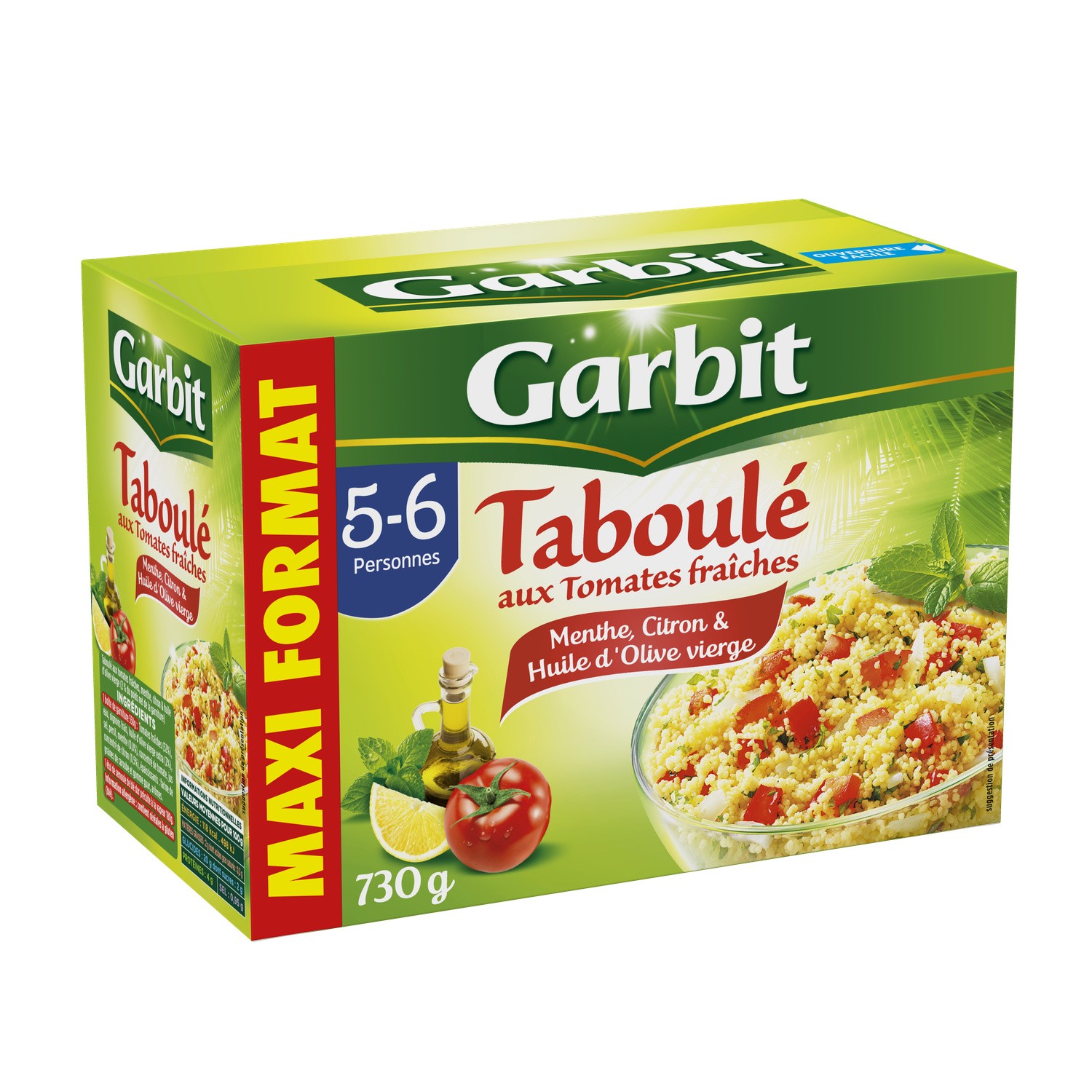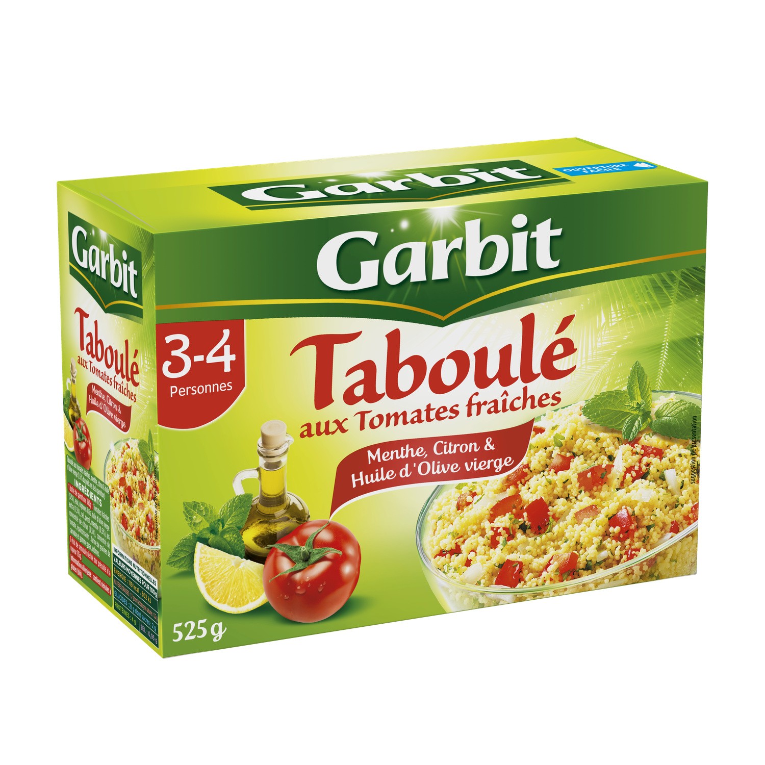 Taboulé aux tomates fraîches, menthe, citron & huile d'olive vierge (2% du poids net de la garniture).Ingrédients : 1 BOITE DE GARNITURE 550 G: Tomates...