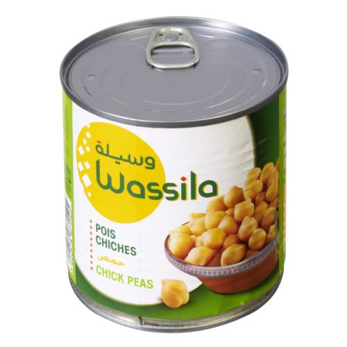 Pois chiches. Ingrédients : Pois chiches secs trempés - eau - sel. traces de _soja_ et _gluten_. Quantité : 400 g Marque : Wassila
