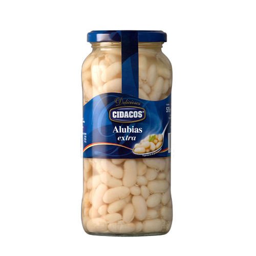 Alubias extra. Ingrédients : Alubias, agua y sal. Antioxidantes: E-385 y E-223 (_sulfito_). Quantité : 570 g neto, 400 g escurrido, 580 ml Marque :...