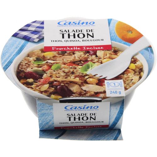 Salade au thon, aux légumes, au quinoa et au boulgour.Ingrédients : Quinoa et boulgour précuit 26% (eau - quinoa blanc 9,2% et rouge 1,8% -...