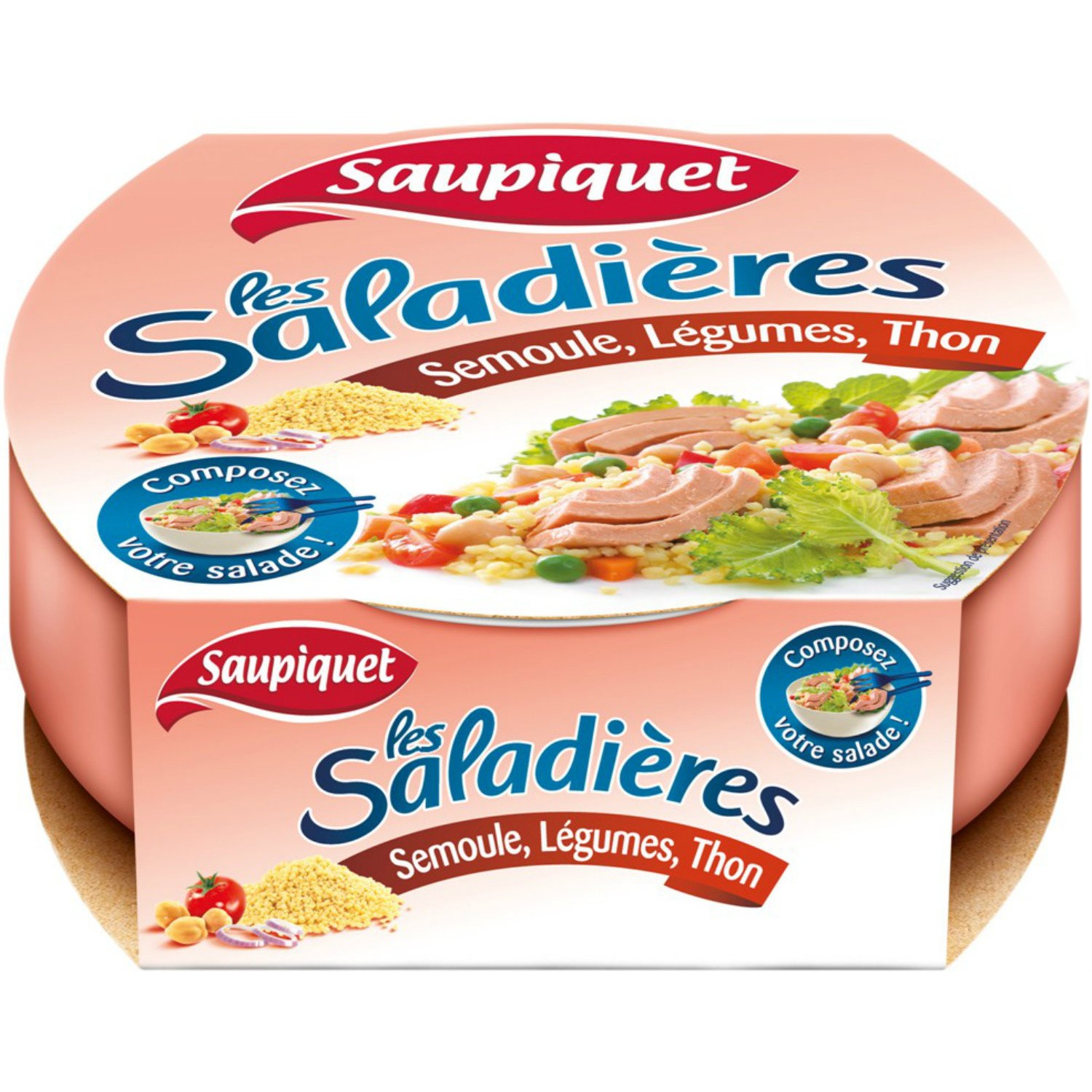 Salade au Thon.Ingrédients : Semoule de _blé_ (35 %), légumes (25 %) (pois chiches (6 %), carottes, petits pois, poivrons, tomates cerises (3 %), oignons...