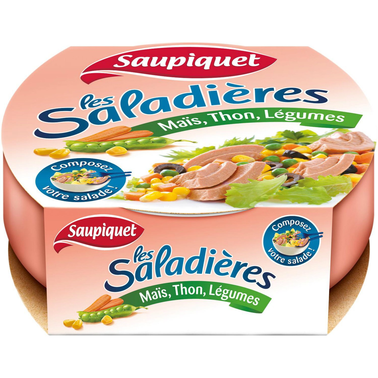 Salade aux légumes et au thon.Ingrédients : Maïs 25% - _thon_ 20% (soit 62,5g à l'ouverture) - poivrons rouges 9,4% - carottes 8,1% - eau...