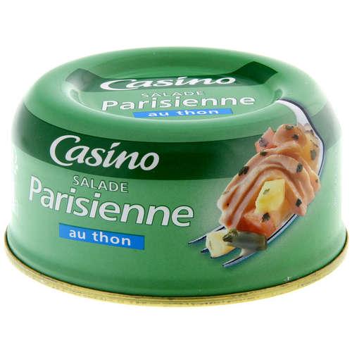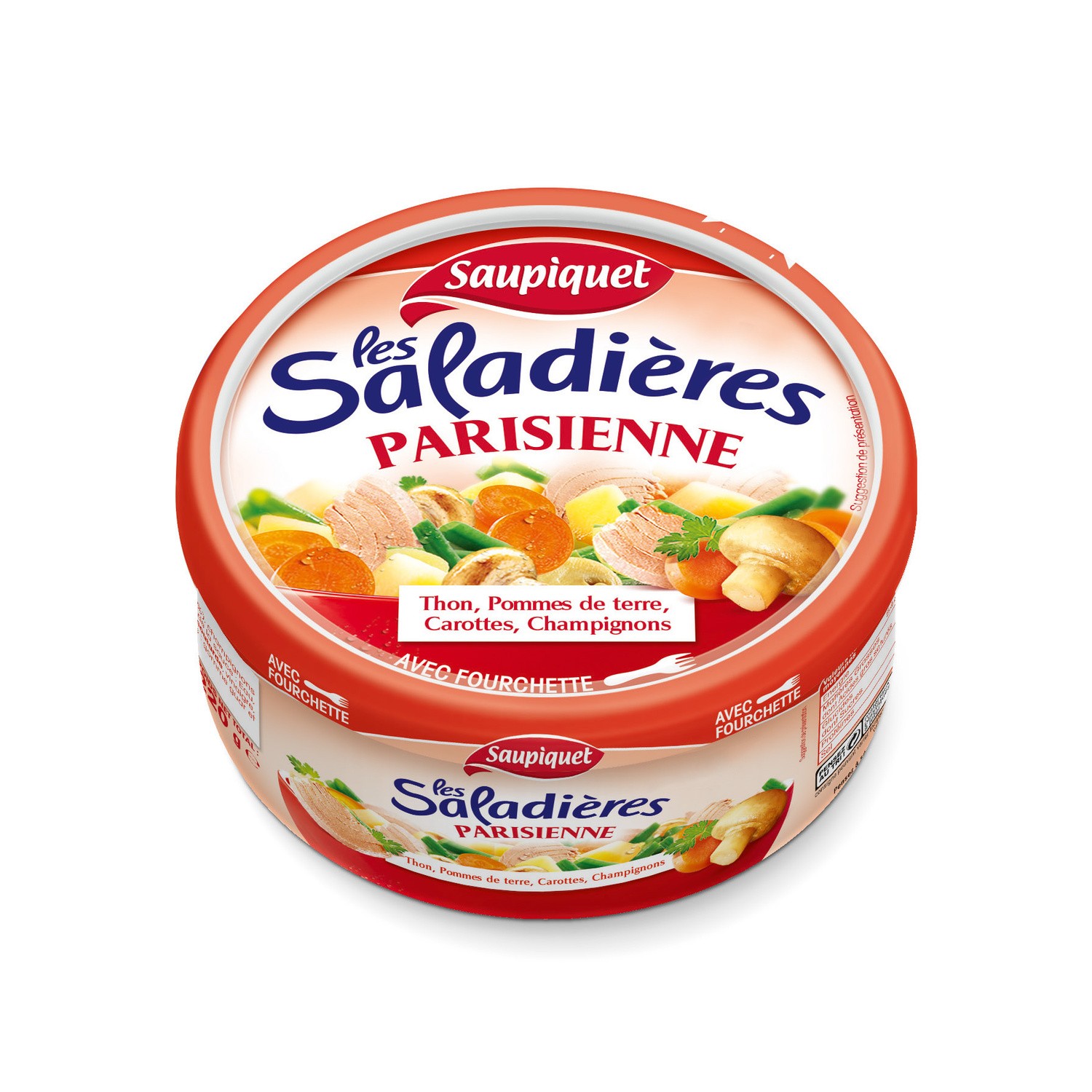 Salade au thon.Ingrédients : Légumes (pommes de terre (14%), carottes (11%), champignons (8%), haricots verts, persil), sauce, _thon_ (22%). Composition de la sauce : Eau,...