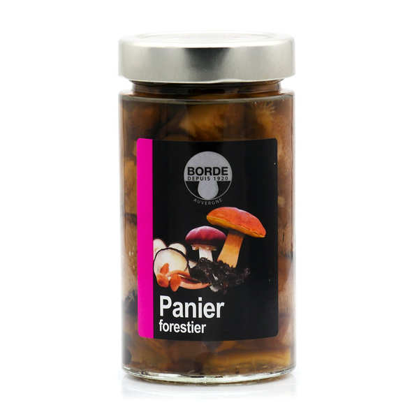 Panier forestier. Ingrédients : Bolets jaunes (Suillus luteus/granulatus), Armillaires (Armillaria mellea), Strophaires (Stropharia rugosa), Pleurotes (Pelurotus ostreatus), Champignons noirs (Auricularia polytricha), eau, sel, acidifiant :...
