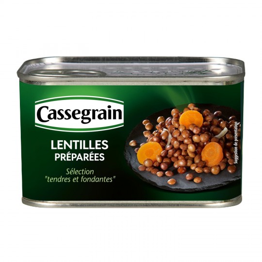 Plat préparé en conserve. Ingrédients : Eau, lentilles blondes sèches trempées 32%, carottes 4% , arômes (BLE), oignons 1%, sel, une feuille de laurier, graisse...