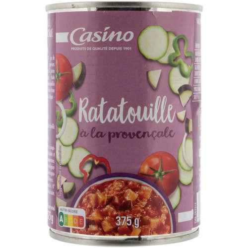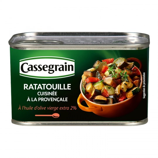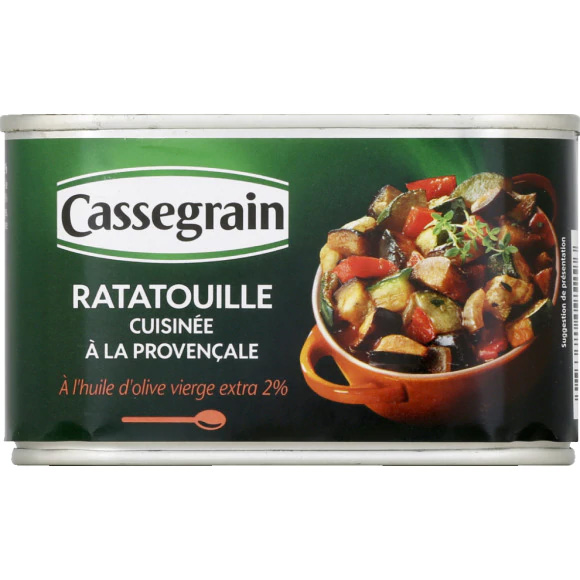 Ratatouille à la provençale. Ingrédients : Courgettes 33,3% - tomates 24,2% - jus de tomates - aubergines 10,8% - poivrons rouges et verts 6,7% -...
