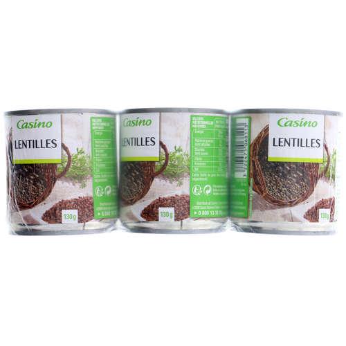 Lentilles. Ingrédients : Eau - lentilles sèches trempées - sel - arôme naturel. traces de _gluten_. Quantité : 400 g Marque : Casino