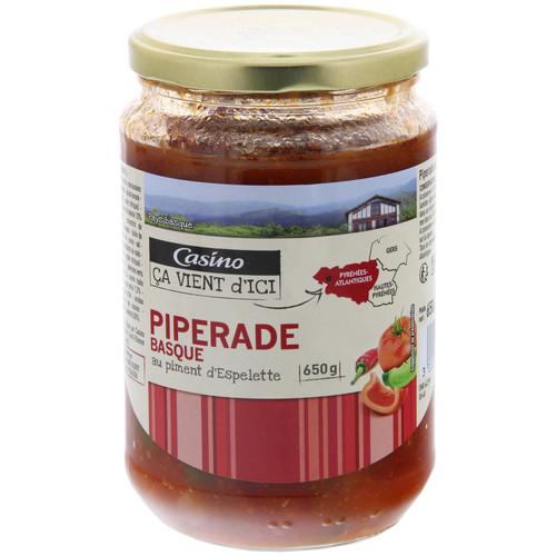 Piperade au piment d'Espelette. Ingrédients : Tomates pelées concassées 54% (tomates - jus de tomate - acidifiant: acide citrique)- sauce à base de tomate 13%...