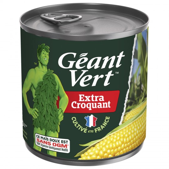 Maïs doux en grains extra croquants. Ingrédients : Maïs doux en grains sans OGM, eau, sel. Quantité : 300 g Marque : Géant Vert Origine...