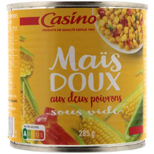 Maïs doux en grains, poivrons rouges et verts sous vide. Ingrédients : Maïs doux en grains 79% - poivrons rouges et verts 5.4% - eau...