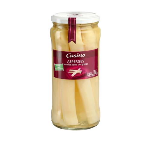 Asperges blanches pelées très grosses. Ingrédients : Asperges blanches - eau - sel - acidifiant : acide citrique. Quantité : 72 cl Marque : Casino...