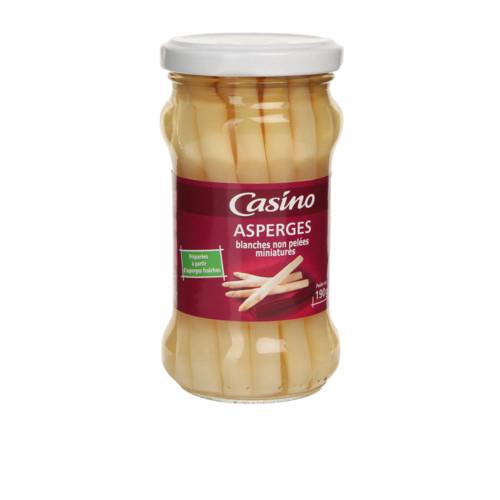 Asperges blanches pelées miniatures. Ingrédients : Asperges blanches - eau - sel - acidifiant : acide citrique. Quantité : 212 ml Marque : Casino Origine...