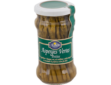 Asperges vertes. Ingrédients : Asperges, eau, sel, acide citrique. Quantité : 110 g Marque : Olabe