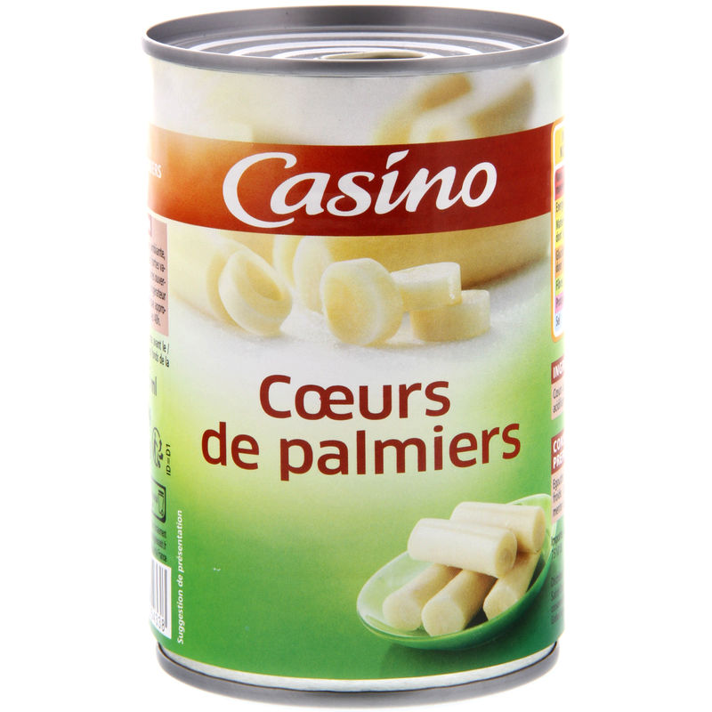 Cœurs de palmier. Ingrédients : Cœurs de palmiers - eau - sel - acidifiant: acide citrique. Quantité : 400 g Marque : Casino