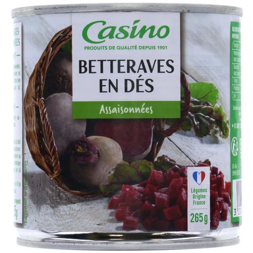 Betteraves rouges en dés assaisonnées. Ingrédients : Betteraves rouges en dés (origine France) - eau - vinaigre d'alcool - sucre - sel - arôme naturel....