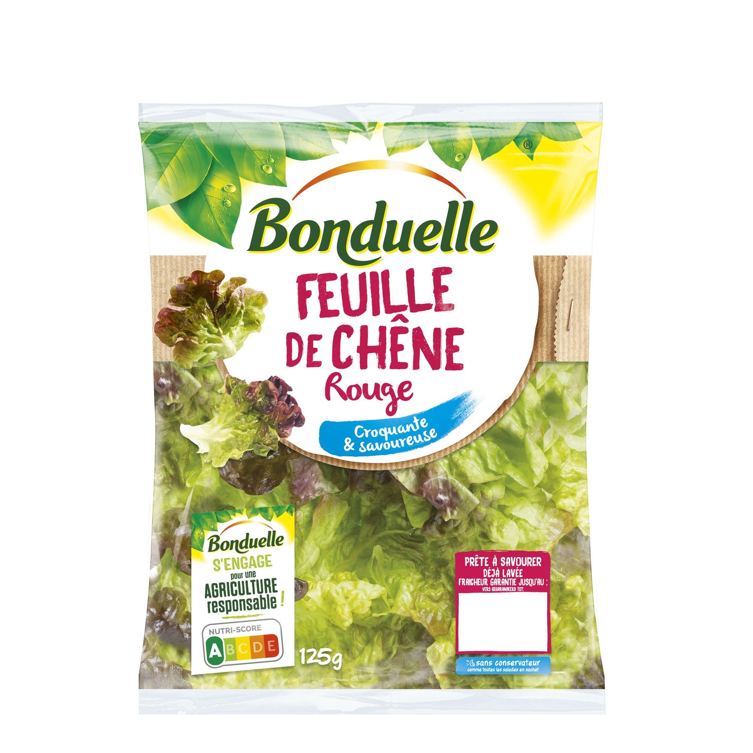 salade prête à l'emploi . Ingrédients : feuille de chêne rouge Quantité : 125 g Marque : Bonduelle