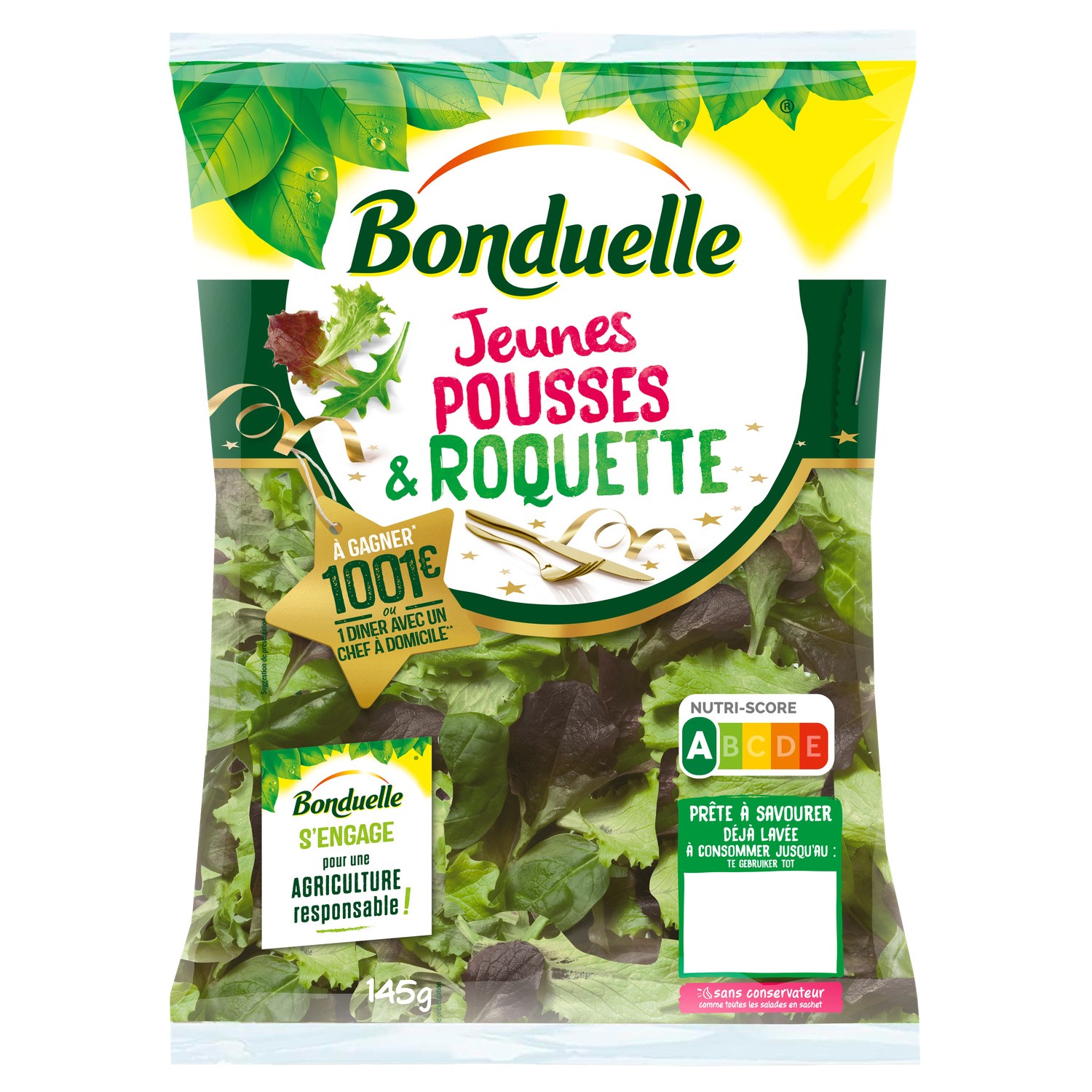 Bonduelle Roquette. Ingrédients : Roquette/ Salade conditionnée sous atmosphère ; Verpakt onder beschermende atrn6sfe».1 A conserver entre +1 oc et +40C Te bewaren tussen 1...
