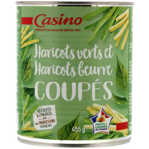 Mélange de haricots verts et de haricots beurre coupés. Ingrédients : Légumes (origine France) en proportion variable (haricots verts coupés, haricots beurre coupés) - eau...