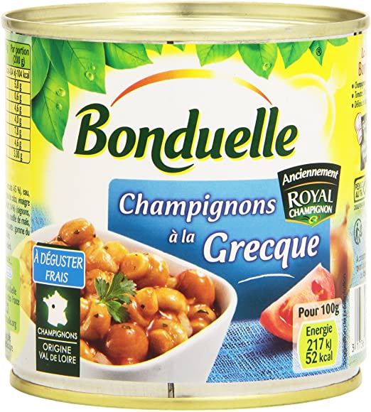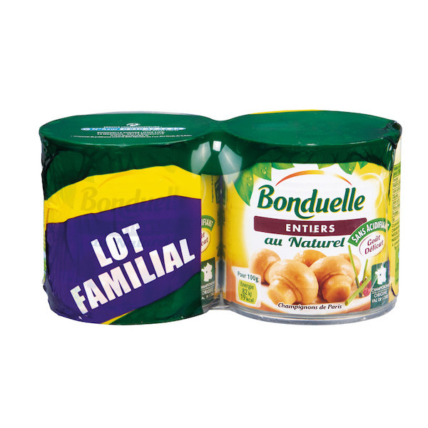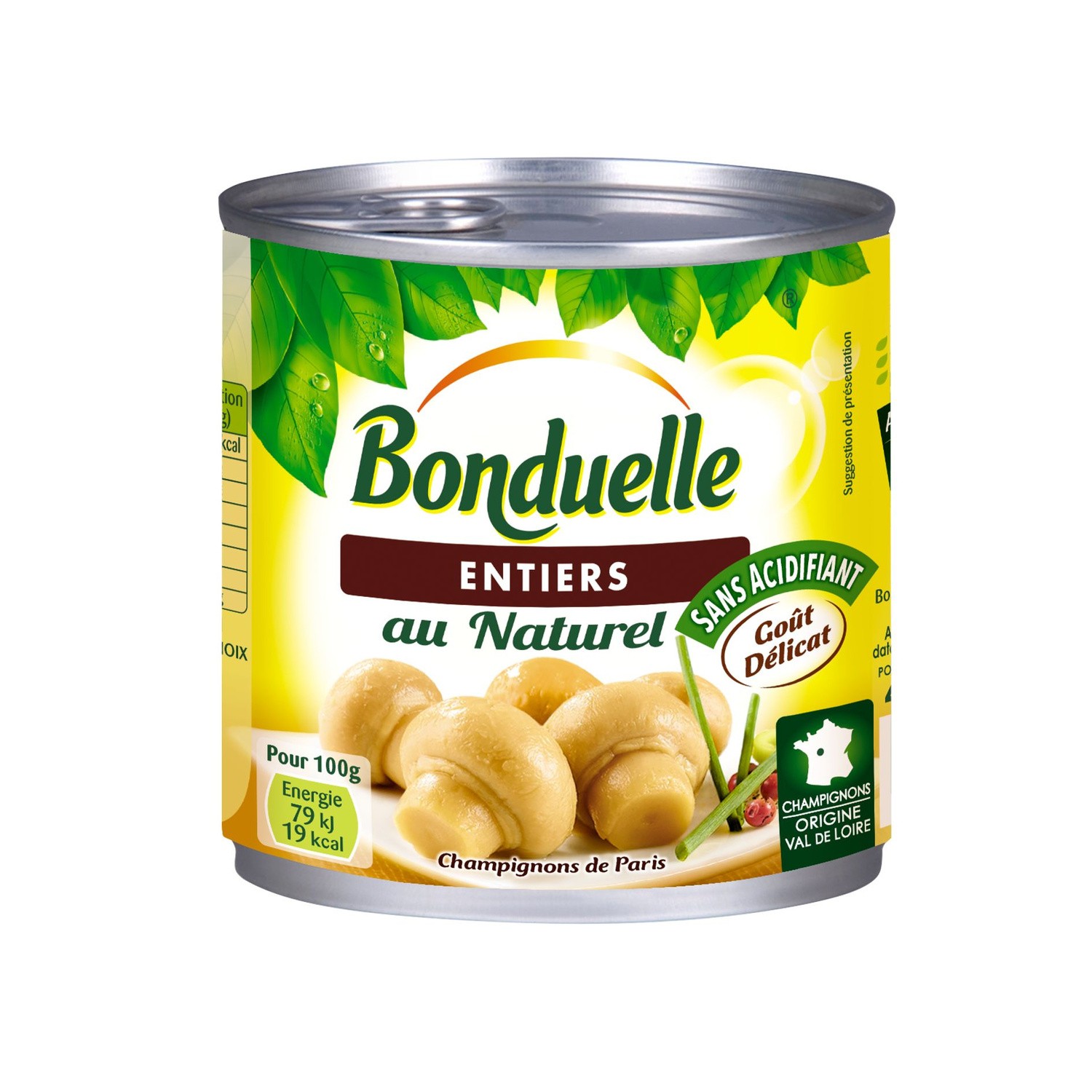 Champignons de Paris entiers 1er choix. Ingrédients : Champignons, eau, sel Quantité : 400 g Marque : Bonduelle Origine : Val de Loire,France