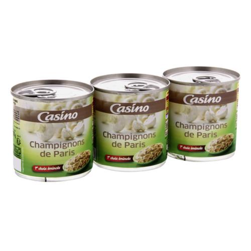Champignons de Paris 1er choix émincés. Ingrédients : Champignons de Paris - eau - sel - correcteur d'acidité: acide citrique. Quantité : 3 x 200...