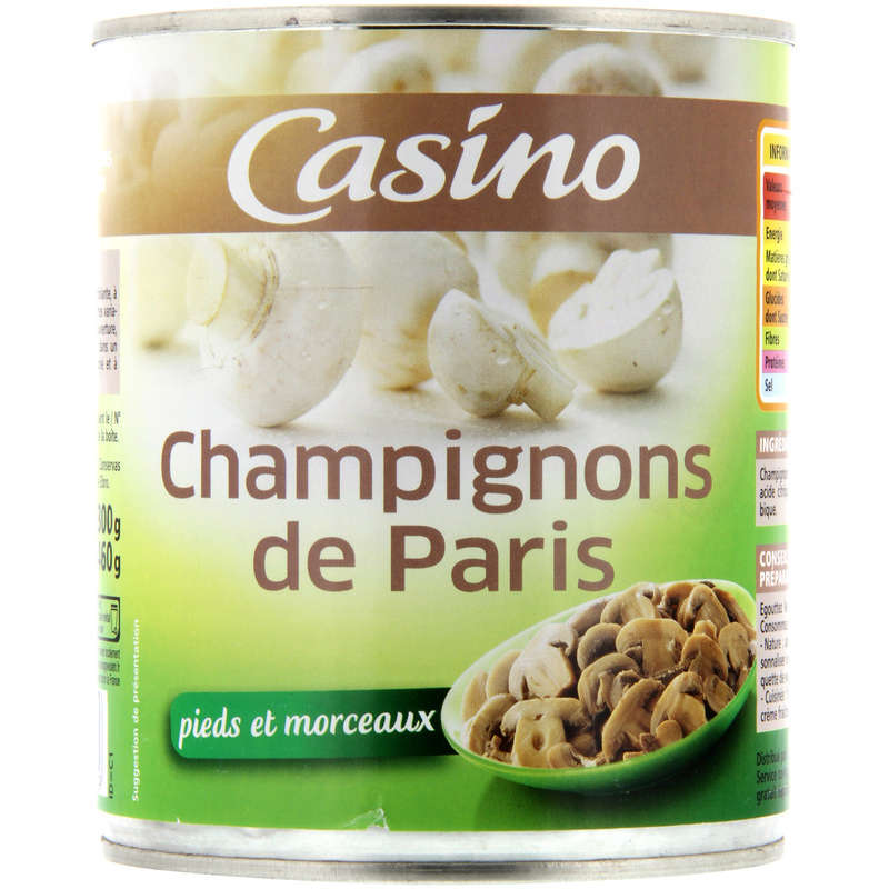 Champignons de Paris. Ingrédients : Champignons de Paris, eau, sel, acidifiant : acide citrique, antioxydant : acide ascorbique. Quantité : 115 g Marque : Casino...