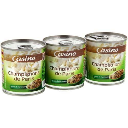 Champignons de Paris Pieds et Morceaux. Ingrédients : Champignons de Paris - eau - sel - correcteur d'acidité: acide citrique Quantité : 3 x 200...