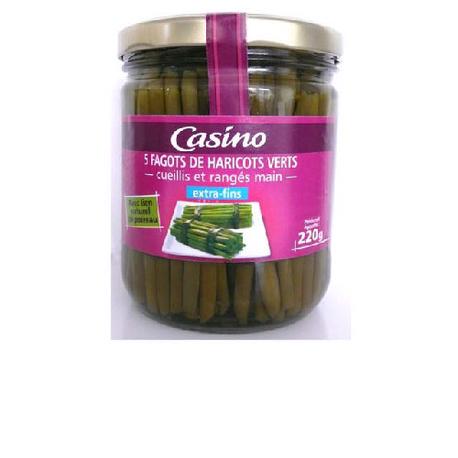 Fagots de Haricots Verts. Ingrédients : Haricots verts extra-fins (liés par une feuille de poireau), eau, oignon, sel. Quantité : 400 g Marque : Cassegrain...