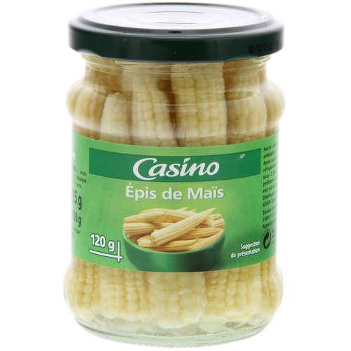 Epis de maïs pasteurisés au vinaigre. Ingrédients : Maïs 55.8%, eau, vinaigre d'alcool, sel, sucre. Quantité : 120 g Marque : Casino
