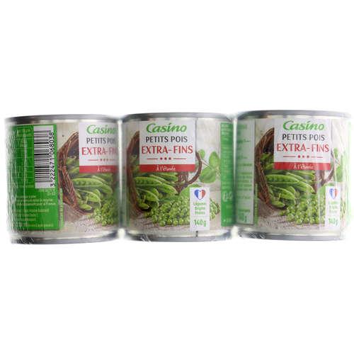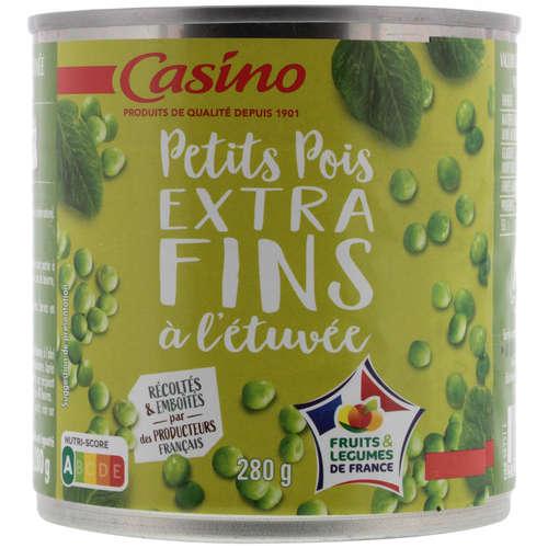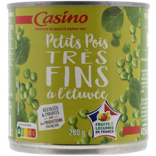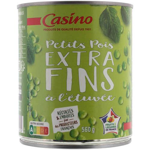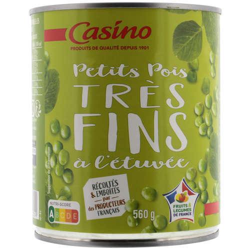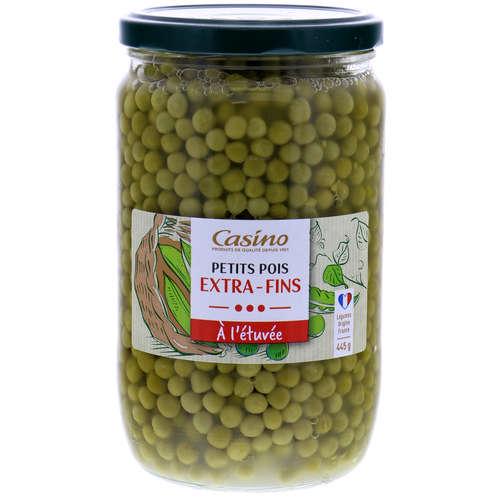 Petits pois à l'étuvée extra-fins. Ingrédients : Petits pois - eau - sucre - sel - arôme naturel. Quantité : 72 cl Marque : Casino...
