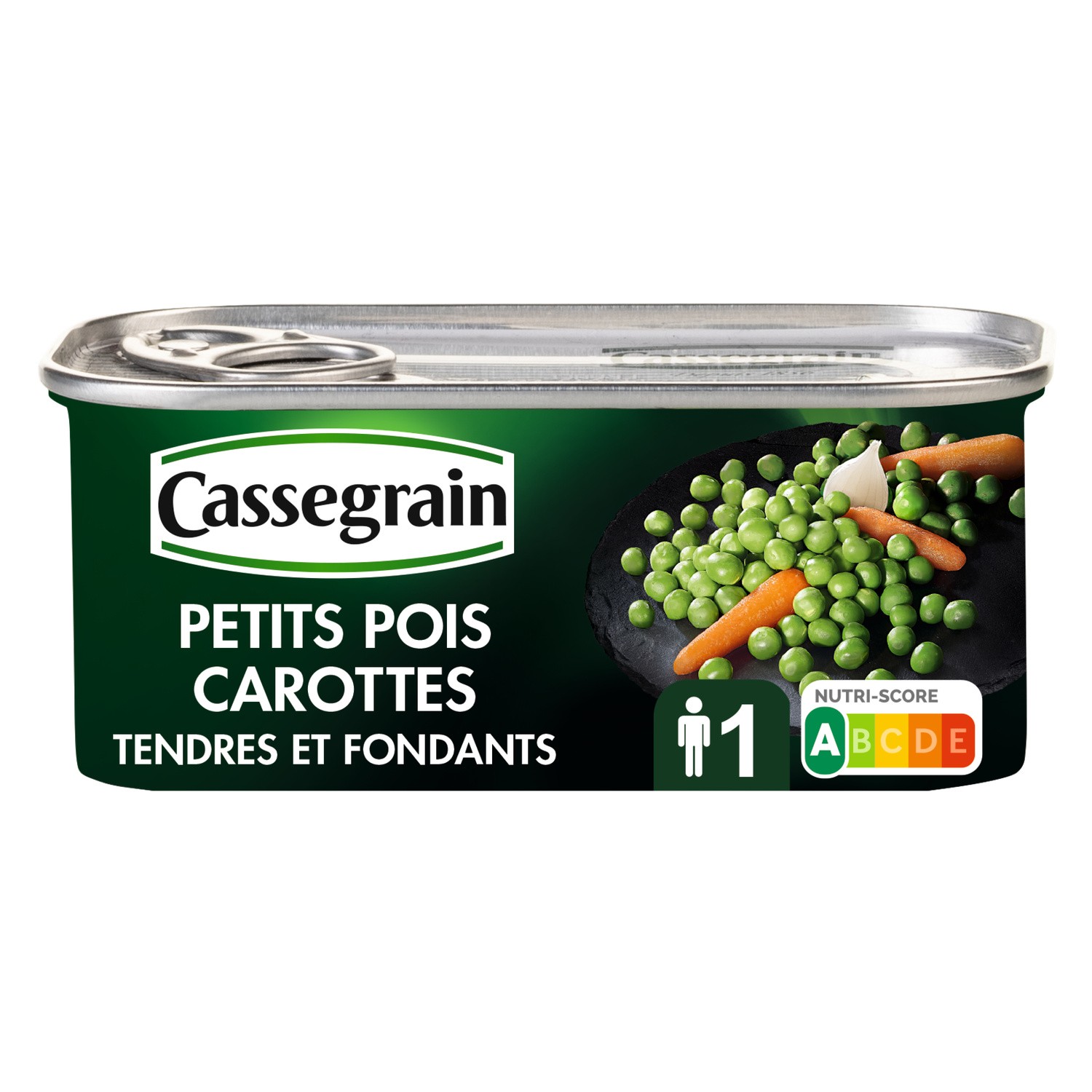 Petits pois et carottes. Ingrédients : Légumes (petits pois 41% , carottes 22%), eau, sucre 3,2%, salade 2,1%, sel, oignon grelot 0,4%, arômes naturels. Quantité...